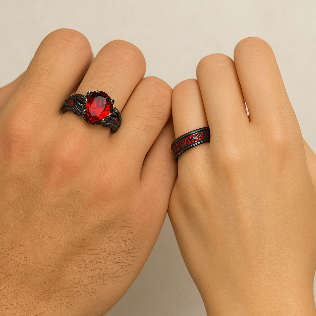 Estos anillos góticos estan diseñados para parejas que fusionan elegancia y oscuridad. Cada pieza es única, pensada para almas que se reconocen en lo profundo. No son solo anillos… son un vínculo eterno para quienes aman con intensidad